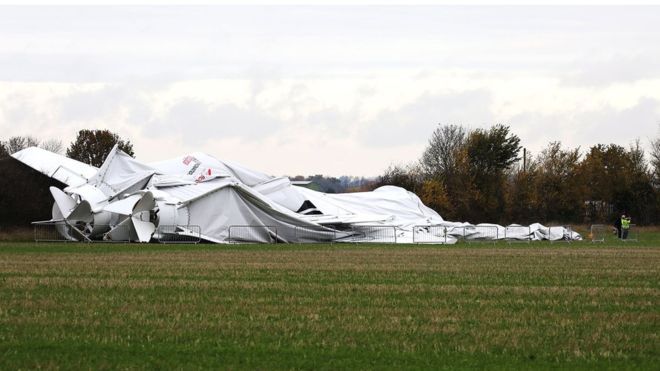 Potrivit BBC, două persoane aflate la sol au suferit răni minore. Airlander 10, supranumit „fundul zburător”, un hibrid dintre un dirijabil şi un avion, s-a detaşat de funiile care îl ţineau la sol, iar vântul l-a dus spre copaci.
