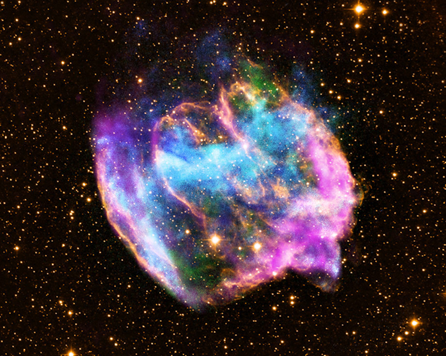 La 26 de mii de ani lumină există ciudata nebuloasă W49B. Acest nor de gaz cu formă asemănătoare cu cea a unui butoi împrăştie resturile unei stele care explodează, adică ale unei supernove. Imaginea pe care o vedeţi este o combinaţie între emisii radio (cele violet), infraroşii (cele galbene) şi raze X (cele de culoare albastră şi verde).