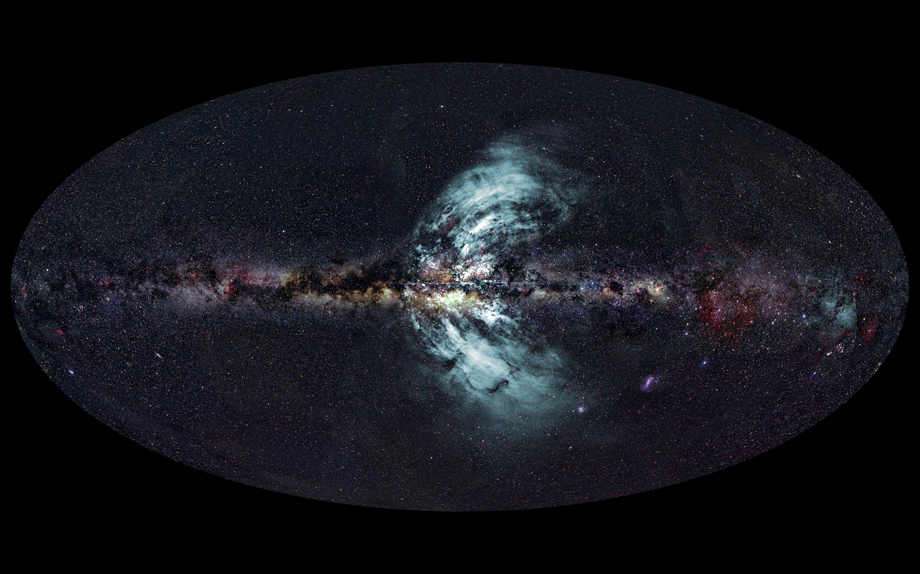 Această imagine arată bulele suprapuse peste o imagine cu galaxia noastră. Astfel, creatorii imaginii încearcă să ne arate că dacă am putea vedea cu ajutorul undelor radio, atunci am observa că aceste bule acoperă jumătate din cer