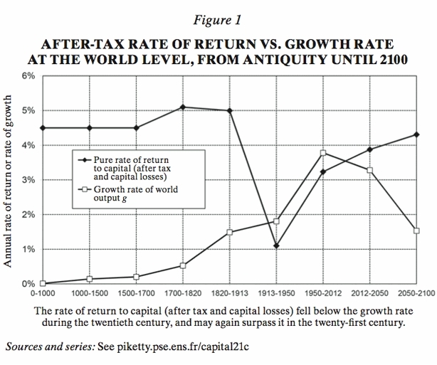 Pornind de la aceste date istorice, Piketty a enunţat o teorie a capitalului şi a inegalităţii. Economistul francez afirmă că bogăţia creşte mai repede decât rata de creştere a economiei (concept sintetizat în expresia „r > g”, unde r reprezintă rata rentabilităţii capitalului, iar g reprezintă rata creşterii economice). Datele colectate de Piketty arată că g, rata de creştere economică, este în medie de 5%, însă în ultimele decenii ea a fost sub acest nivel. Deoarece rentabilitiatea capitalului este mai mare, bogăţia celor deja bogaţi creşte mai rapid decât economia unei ţări. Aşadar, deoarece r > g, bogaţii vor deveni şi mai bogaţi, iar inegalitatea va creşte.