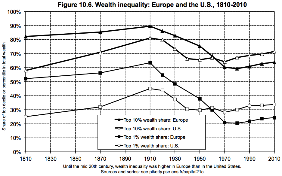 În secolele al XVIII-lea şi al XIX-lea, în societăţile Europei occidentale se înregistra un nivel uriaş al inegalităţii. Bogăţia depăşea cu mult nivelul venitul naţional, fiind concentrată în mâinile câtorva familii bogate situate în pătura de sus a structurilor sociale. În ciuda faptului că industrializarea a dus la creşterea treptată a salariilor muncitorilor, acest sistem s-a menţinut, inegalitatea fiind redusă doar în urma celor două războaie mondiale şi a Marii Depresiuni. Distrugerea proprietăţilor, inflaţia şi taxele foarte mari rezultate în urma acestor crize au făcut ca nivelul bogăţiei să scadă considerabil, această perioadă fiind caracterizată de o distribuire relativ egală a bogăţiei şi a veniturilor. Acum, însă, Piketty afirmă că bogăţia începe să-şi recapete supremaţia, importanţa capitalului în economiile moderne atingând niveluri similare celor înregistrate înainte de primul război mondial.