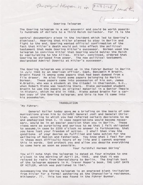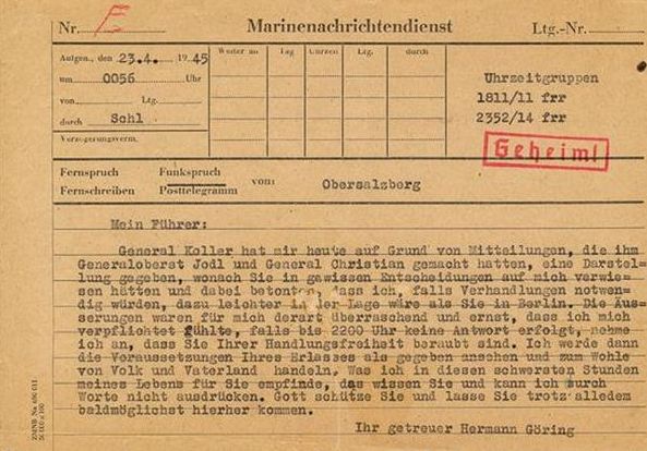 Telegrama conţine răspunsul formulat de Hermann Goering în urma unui ordin secret emis de Adolf Hitler, conform căruia, dacă urmează să păţească ceva, conducerea să fie preluată integral de către adjunctul său.