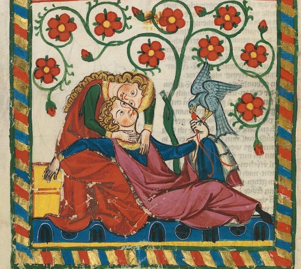 1. Aceasta este o imagine din Codex Manesse, o carte de poezie făcută în Zurich în anul 1304-1305. Fiecare imagine, inclusiv aceasta, descrie o poezie din carte. Aici îl avem reprezentat pe Konrad von Altstetten îmbrăţişându-şi iubita. (Codex Manesse, UB Heidelberg, Cod. Pal. germ. 848, fol. 249v)