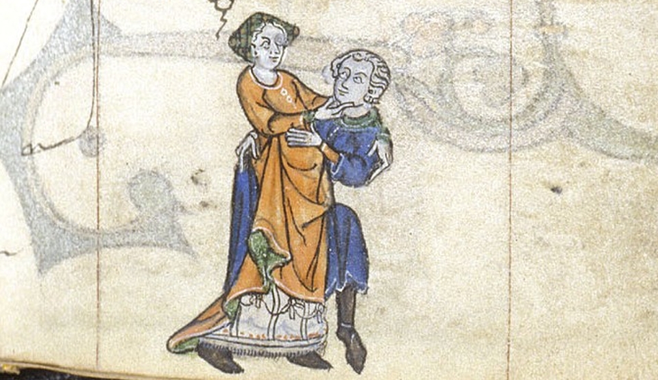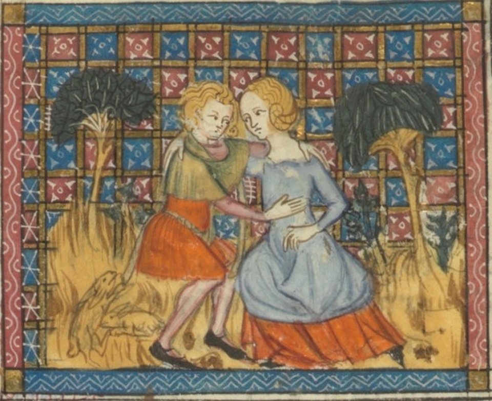 3. O miniatură marginală a unui cuplu care se îmbrăţişează. (British Library Stowe 17 f. 143)
