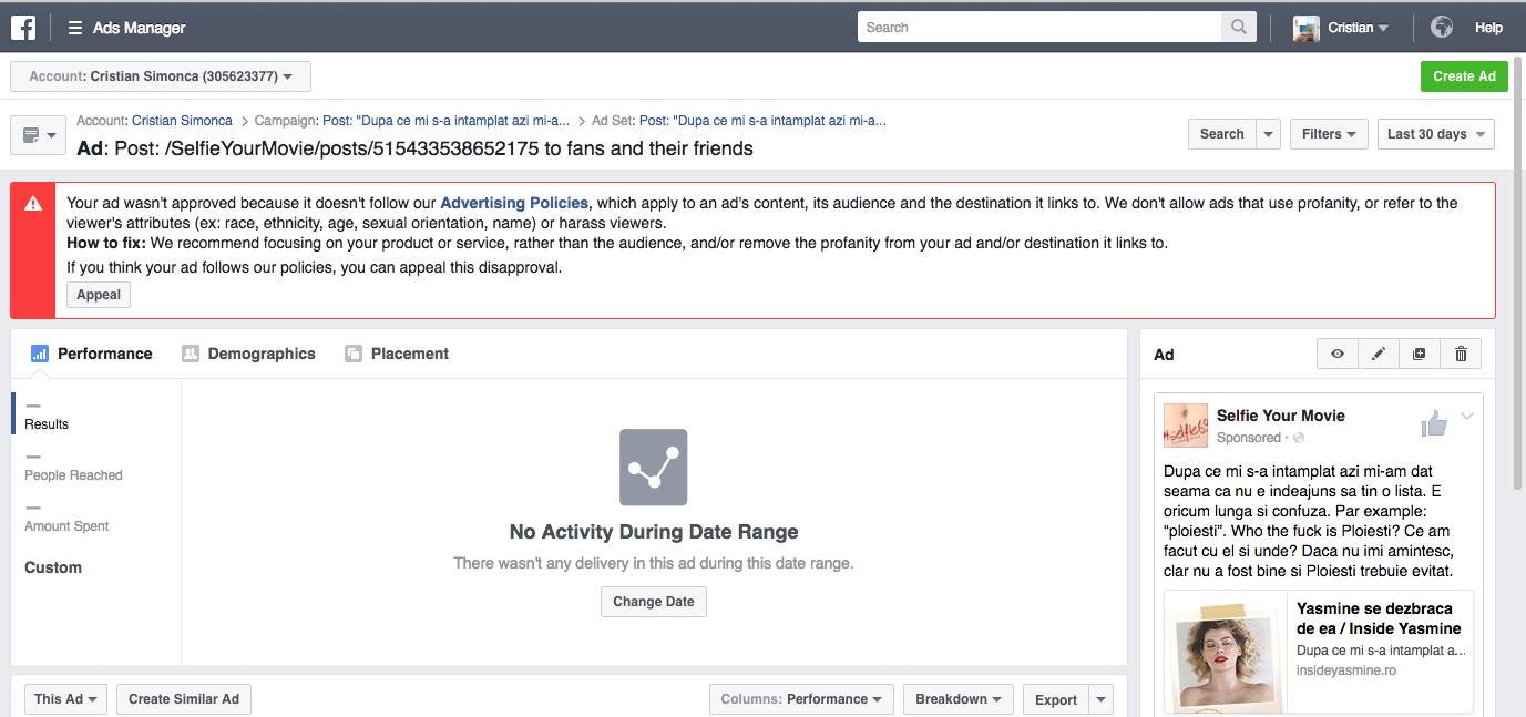 *Mesajul facebook: Your ad wasn’t approved because it doesn’t follow our Advertising Policies, which apply to an ad’s content, its audience and the destination it links to. We don’t allow ads that use profanity, or refer to the viewer’s attributes (ex: race, ethnicity, age, sexual orientation, name) or harass viewers.How to fix: We recommend focusing on your product or service, rather than the audience, and/or remove the profanity from your ad and/or destination it links to. If you think your ad follows our policies, you can appeal this disapproval.