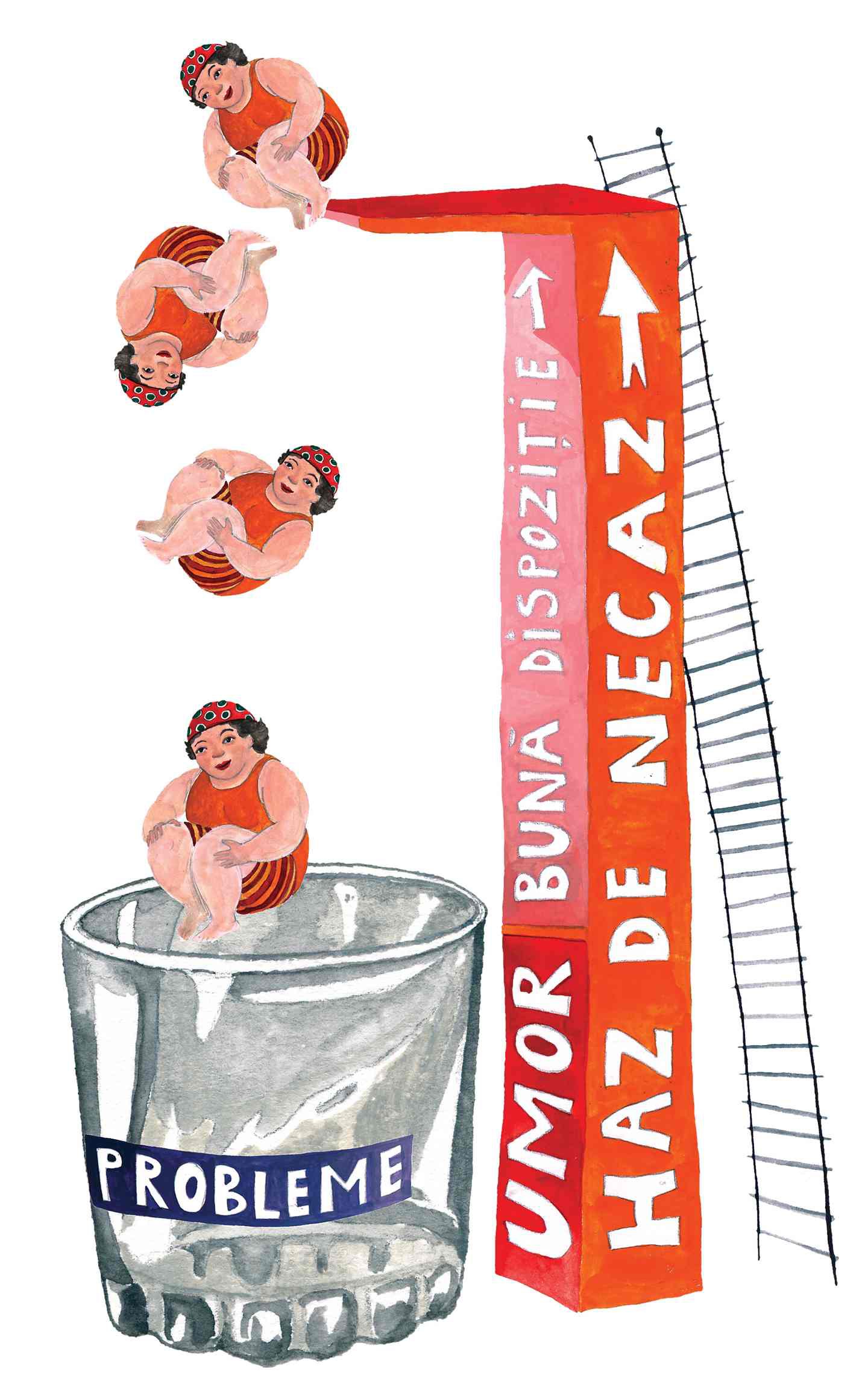 Paharul din desenul lui Sebastian Opriţă are o etichetă pe care apare scris: „Probleme”. Pe trambulină e expresia: „Haz de necaz”. Ilustraţia face parte din cartea bilingvă (în italiană şi română) cu titlul „Poveşti ale Speranţei”. Semnificaţia desenului cu doamnele înotătoare, avatari ai aceleiaşi femei durdulii cu cască de protecţie, este: „Nu-ţi face griji”.