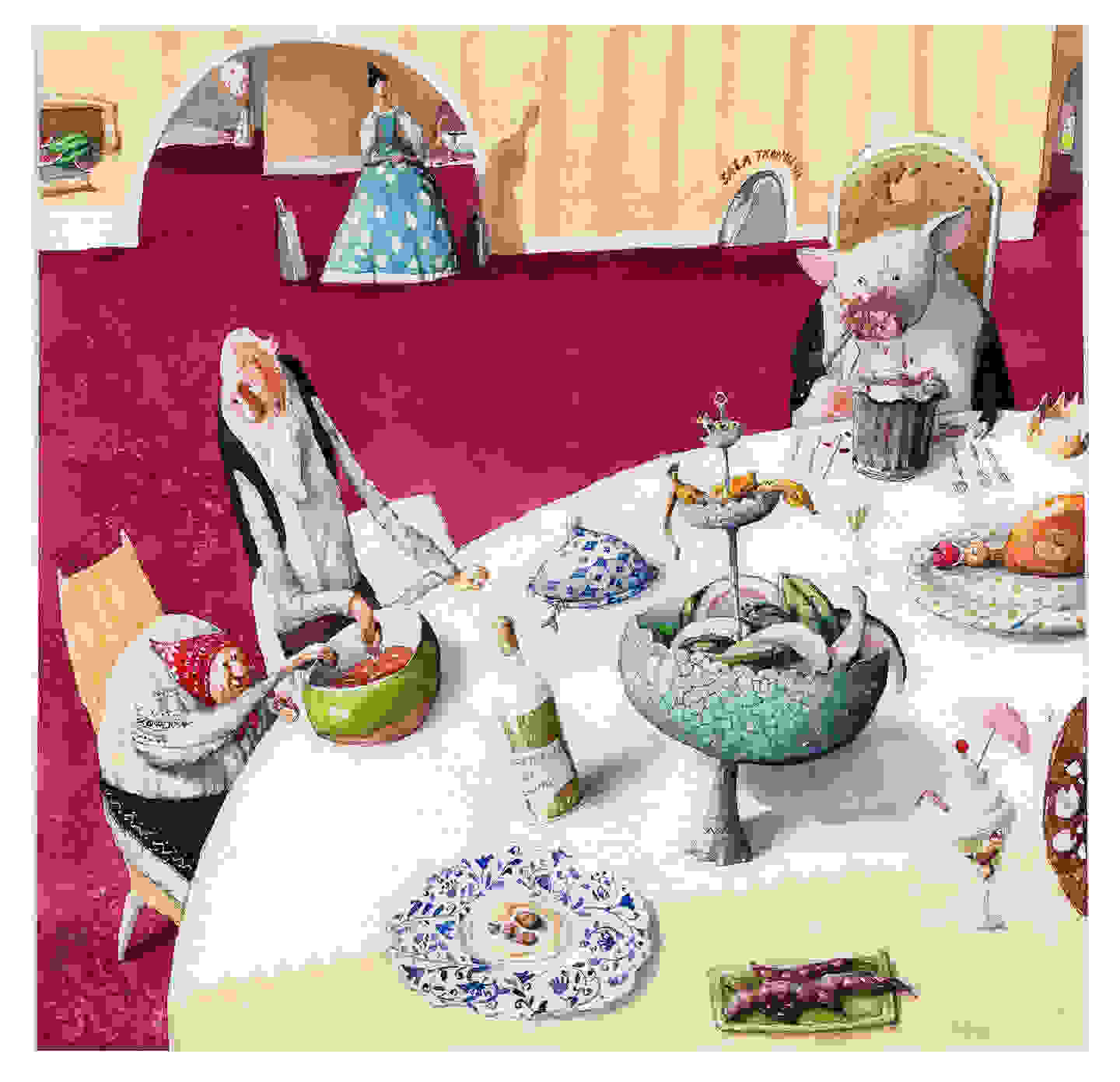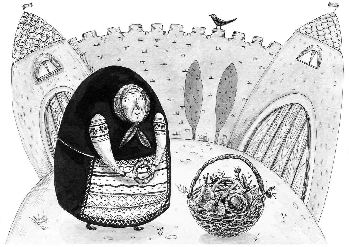 Ilustraţia lui Igor Vieru este pentru binecunoscuta „Capră cu trei iei”. E un basm de groază, zic jurnaliştii de la The Guardian, despre lupul care înhaţă şi mănâncă doi dintre iezii care-i deschid uşa căsuţei, deşi capra le dă povaţă să se fereacă de ciocănitul străin. În desen, capra şi ai săi trei iezi poartă costume tradiţionale româneşti, ie şi brâu, pereţii sunt decoraţi cu macat brodat, farfuriile sunt de lut – la fel ca într-o casă ţărănească din România.