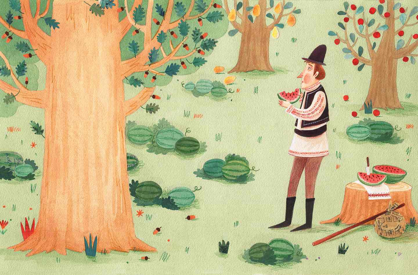 Un călător se opreşte sub un stejar să se odihnească. Găseşe lubeniţe. Planta care rodeşte pepenii roşii este atât de mică, iar fructele ei aşa zemoase şi mari, încât omul se întreabă: de ce stejarul face ghinda atât de mică? Apoi o ghindă cade şi-i loveşte nasul. Drumeţul se râzgândeşte asupra întrebării sale existenţiale. Aceasta este o poezie scurtă şi înduioşătoare inclusă de Anton Pann într-o colecţie de „Fabule şi istorioare”. Ilustrator: Livia Coloji