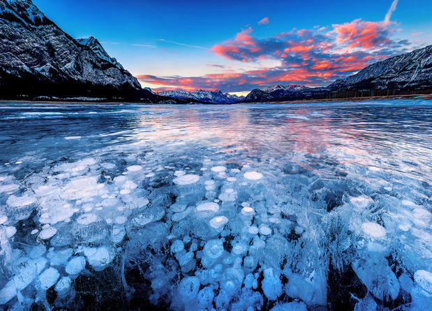 Plantele din lacul Abraham din Canada eliberează metanul care îngheaţă. Metanul, un gaz inflamabil, produce efectul de seră, dar, uneori, poate fi elementul artistic de pe suprafaţa unui lac. Lacul artificial a fost creat în 1972 odată cu construcţia barajului Bighorn şi a primit numele lui Silas Abraham, un locuitor din secolul XIX al văii râului Saskatchewan. Pentru orice fotograf care merge pe lac să surprindă frumuseţea toxicităţii există atât riscul ruperii gheţii, cât şi al exploziei metanului.