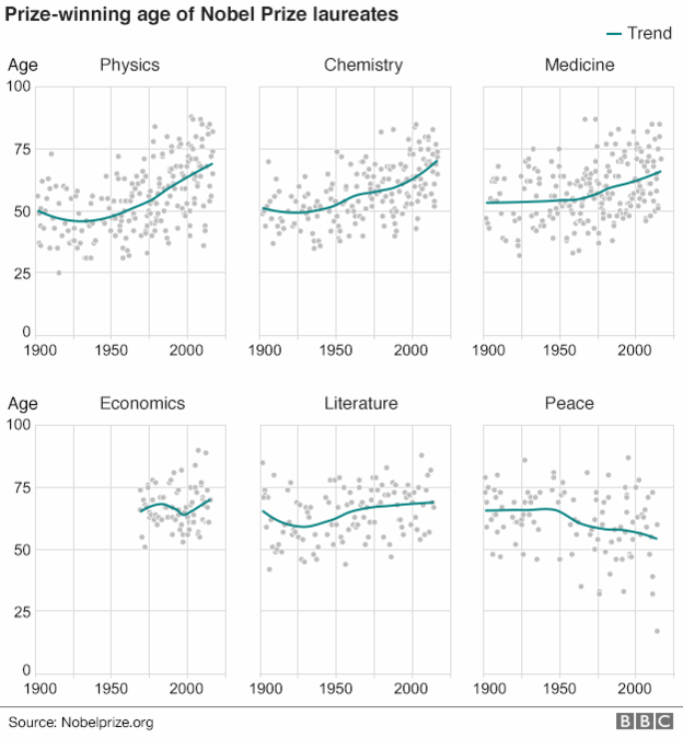 Rata vârstei câştigătorilor Premiului Nobel este de 72 de ani, dar nu întotdeauna a fost aşa. Laureaţii Premiului Nobel din acest an din domeniul fizicii, chimiei şi medicinei sunt toţi bărbaţi cu vârste cuprinse între 65 şi 72 de ani.