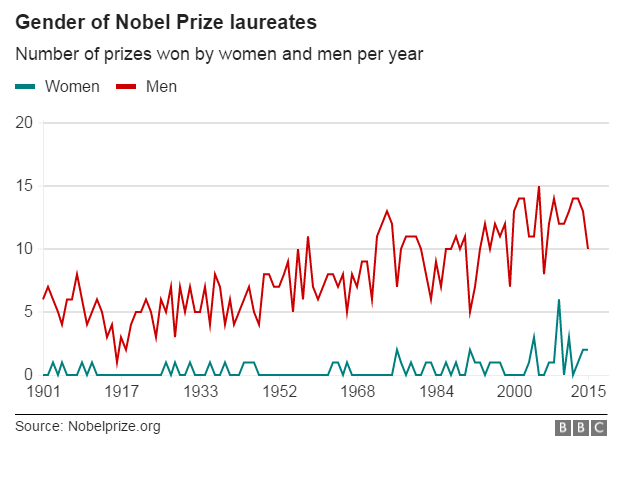 Mai mult decât atât, de-a lungul timpului, majoritatea câştigătorilor au fost bărbaţi. Bărbaţii sunt mult mai prezenţi în procesul de cercetare decât femeile dar, odată ce diversitatea îşi face simţită prezenţa, reprezentarea egală devine din ce în ce mai vizibilă. În 1903, când Marie Curie nu a fost nominalizată pentru câştigarea Premiului Nobel, soţul său şi partenerul lor în procesul de cercetare au protestat şi au refuzat nominalizarea. Însă, în urma protestelor, aceasta a devenit prima femeie care a câştigat Premiul Nobel.