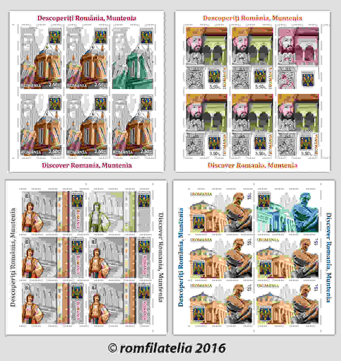 Ilustraţia celor patru timbre este completată de heraldica zonei (stema Munteniei), iar cele două plicuri prima zi ale emisiunii ilustrează un mozaic de imagini, făcând trimitere către detalii arhitecturale specifice Mănăstirii Stavropoleos din Bucureşti şi detalii specifice portului tradiţional femeiesc din Muntenia.