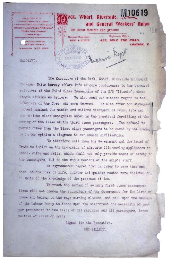Printre cei care au încercat să caute răspunsuri a fost şi Benn Tillett, autorul acestei scrisori. Acesta era un comerciant cunoscut al vremii. A criticat antagonismul de clasă care era extrem de vizibil la bordul Titanicului şi a afirmat faptul că, atunci când a avut loc tragedia, cu cât biletul a fost mai scump, cu atât şansele de supravieţuire au fost mai mari. În ceea ce îi priveşte pe pasagerii de la clasa a-III-a, doar 25% au supravieţuit.