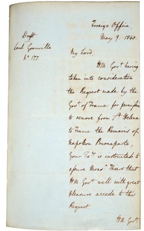 Această scrisoare este o ciornă, fiind păstrată în Biroul Afacerilor Externe al Marii Britanii şi este un răspuns al Lordlui Palmerston către dorinţa francezilor, în care îşi exprima plăcerea de a face acest lucru. Ca rezultat, guvernul franncez a trimis către Insula Sf. Elena un vas pentru a aduce rămăşiţele lui Napoleon.