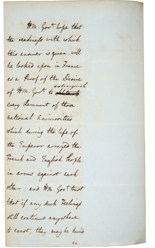 HM. Guvernul speră ca disponibilitatea cu care este dat acest răspuns să fie înţeles de francezi ca o dovadă a dorinţei ca toate ideile naţionaliste care în timpul împăratului Napoleon au adus armatele franceze şi engleze în stare de conflict să fie înlăturate