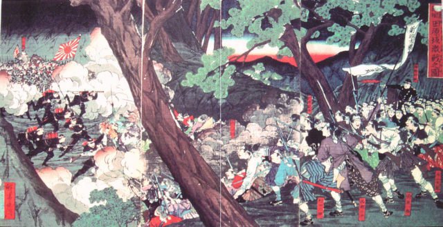 Imaginea prezintă una dintre bătăliile armatei cu rebeliunea. Se observă că samuraii (dreapta) foloseau arme, singura diferenţă fiind îmbrăcămintea mai tradiţională a acestora. Credit: War History Online