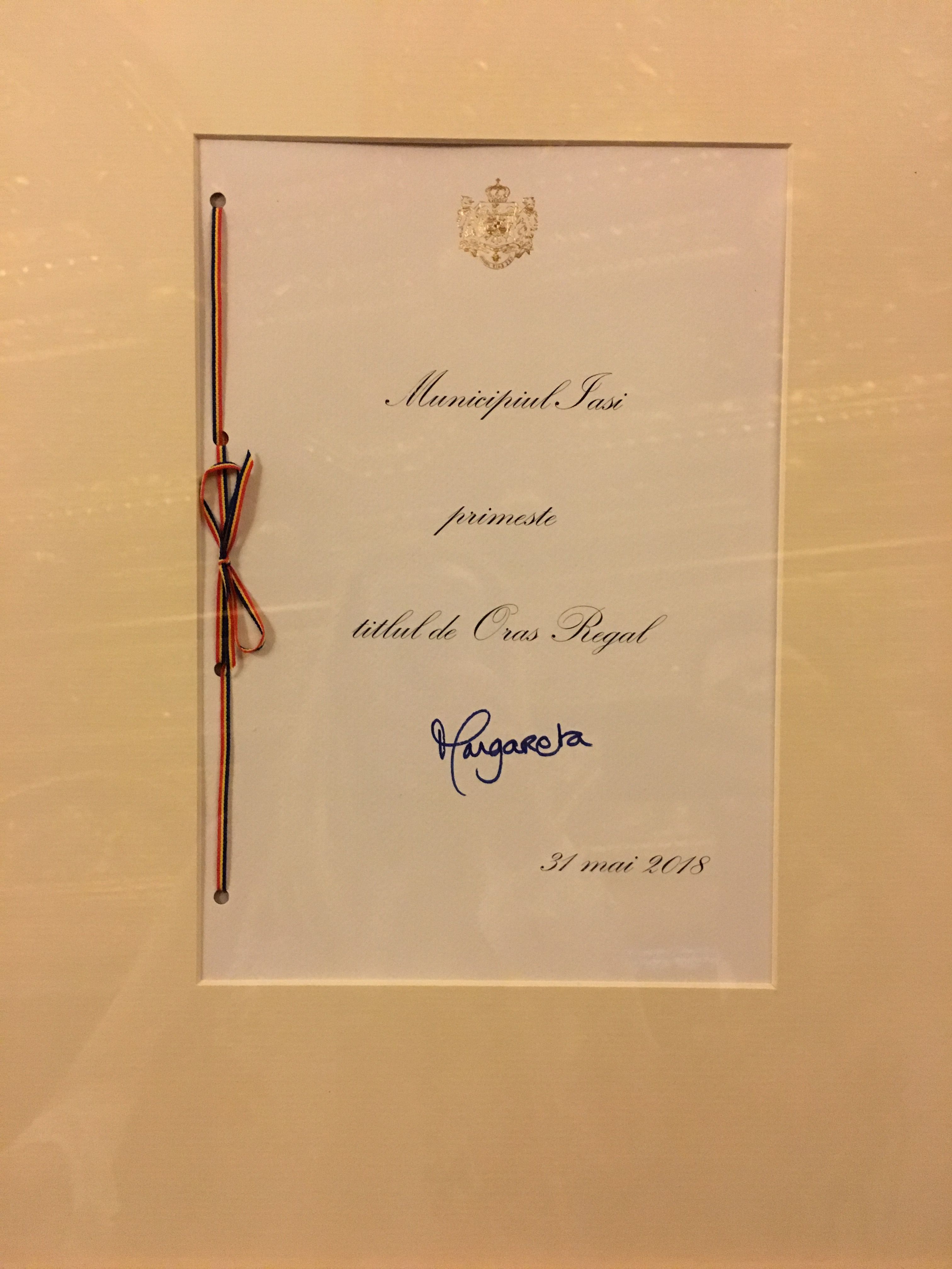 Potrivit Casei Regale, ceremonia de conferire a titlului de ”Oraş Regal” municipiului Iaşi a avut loc la salonul Florentin al Castelului Peleş, în prezenţa reprezentanţilor administraţiei locale a municipiului şi a unor personalităţi din societatea civilă.