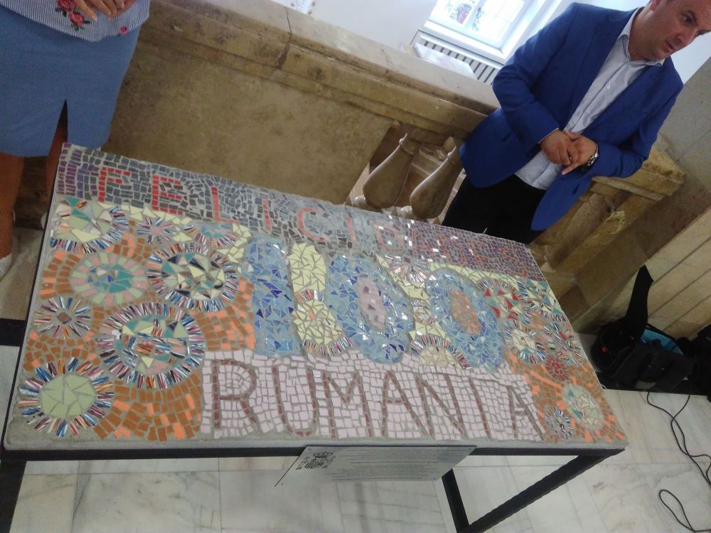 Mozaicul, pe care scrie „Felicidades, 100, Rumania,” a fost donat marţi Consiliului Judeţean Timiş, lucrarea fiind expusă în holul instituţiei.