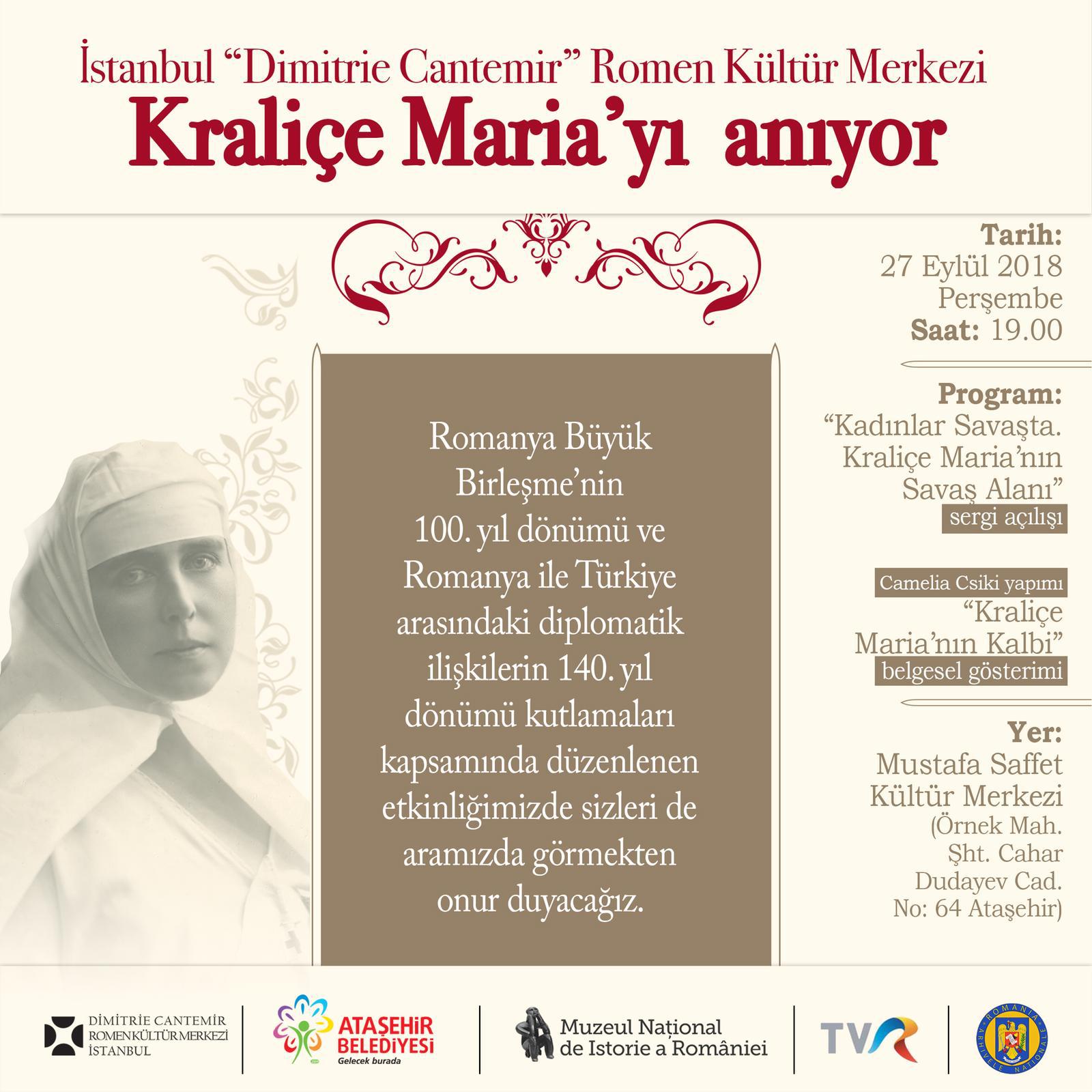 „În anul în care sărbătorim Centenarul Primului Război Mondial şi al Marii Uniri, ICR Istanbul are alături importanţi parteneri naţionali şi locali pentru organizarea acestui dublu eveniment”, se arată în comunicat. Pentru realizarea expoziţiei fotodocumentare „Femeile de pe front. Câmpul de luptă al Reginei Maria”, realizatorii propun un excurs documentar despre contribuţia femeilor din România la Primul Război Mondial, în calitate de combatante pe front sau în spatele liniilor, ca asistente sau infirmiere, ca membre ale Crucii Roşii Române, în spitalele de campanie sau ca activiste în variile asociaţii înfiinţate cu scopul de a-i sprijini pe refugiaţii şi orfanii de război.