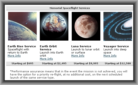 Nici cei din California nu se lasă mai prejos. Fundaţia Celestis poate trimite şapte grame din cenuşă pe orbită, pentru un preţ accesibil. Familia este invitată la lansare şi poate lua acasă un DVD cu filmarea.