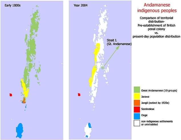 Tribul Jangil a dispărut la începutul secolulului al XX-lea, urmat de Oko-Juwoi şi apoi de majoritatea celorlalte popoare din arhipelag. Soarta lor nu a fost împărtăşită însă de triburile Jarawa şi sentinelez, care au respins cu violenţă orice legătură cu lumea exterioară. În cele din urmă, însă, tribul Jarawa a acceptat contactul începând cu 1998, iar acum existenţa lui este ameninţată de pojar şi turism, de braconierii care îi vânează hrana şi de extinderea aşezărilor şi a drumurilor construite de coloniştii ce trăiesc în arhipelag.
