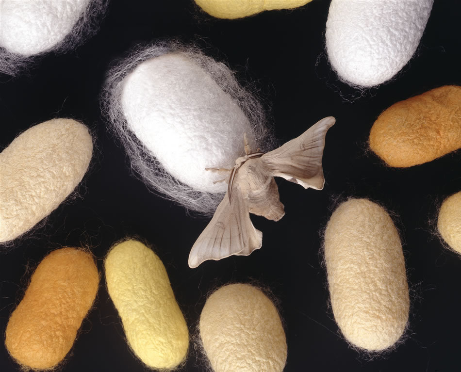 Bombyx mori – fluturele de mătase, ale cărui larve sau omizi sunt cunoscute drept viermi de mătase – este specia crescută azi cel mai mult pentru obţinerea mătăsii. Iniţiate în China în urmă cu vreo trei milenii, creşterea acestor insecte şi producerea mătăsii au fost lungă vreme monopoluri ale împărăţiei chineze. Este cunoscută legenda ce istoriseşte felul în care mătasea a ajuns în Europa: în secolul al VI-ea, în vremea împăratului bizantin Iustinian, nişte călugări nestorieni călători în China s-au întors aducând ascunse în toiegele lor, scobite pe dinăuntru, ouă de viemi de mătase. Timp de câteva sute de ani, Europa a produs mătase, prin crescătoriile înfiinţate în regiunile mai calde, precum sudul Franţei, Italia, chiar şi România. La ora actuală, însă, China şi-a luat revanşa, restabilindu-şi supremaţia în domeniu, cu ajutorul preţurilor scăzute, care au dus la declinul industriei producătoare de mătase în ţările Europei. Estimări realizate de FAO pentru anul 2005 arătau, totuşi, că printre primii 10 producători de gogoşi de mătase din lume (cu China şi India în frunte) s-ar afla, pe locul 9, România – singura ţară europeană în acest top dominat categoric de statele Asiei.