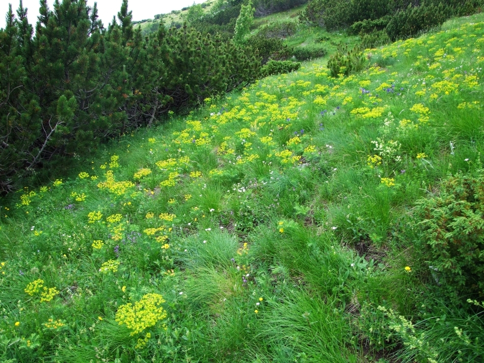 Galbenul e pretutindeni, de parcă plouă cu el, din când în când, peste întreg muntele. Îl ţin mărţişorii, sclipeţii, bulbucii de munte, iarba rănii, cruciuliţei ori genţianelor pătate.