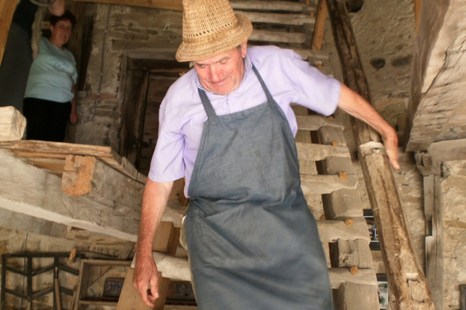 „Asta este slănina mea, stă agăţată aici de şapte luni, de când am tăiat porcul şi se păstrează bine, că e curent şi rece ca la frigider chiar şi vara, când este năduşeală mare. Şi cuiul din bastion este al meu, moştenit de la tata, aici aşa se face. Cuiele nu sunt de cumpărat, şi nici de vânzare, că se lasă moştenire copiilor”, spune Dénes Albert, un sătean în vârstă de 80 de ani, clopotarul bisericii.