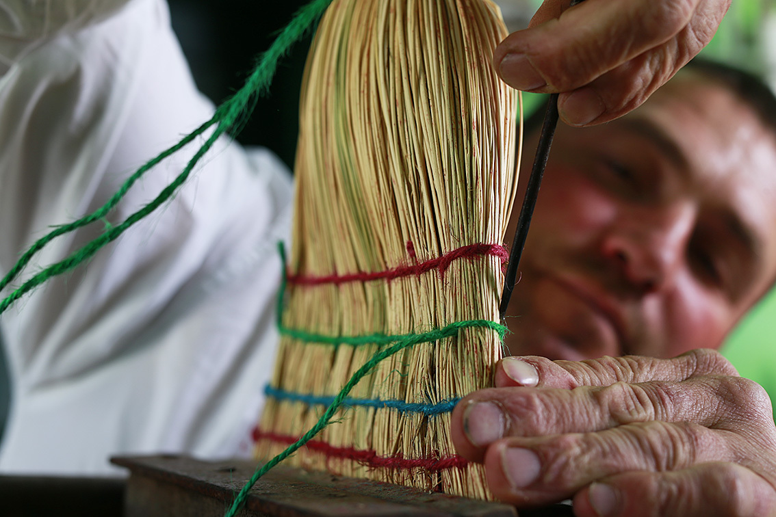 Cristian Bârsan a învăţat de la bunicul lui să facă mături în stilul tradiţional. Pune foarte multă valoare pe faptul că nu coase măturile cu aţă de plastic aşa cum se face acuma, ci cu cea de cânepă colorată, în cele două culori preferate de bunicul lui-verde şi roşu.