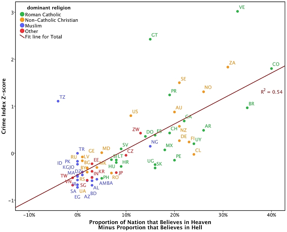 Cercetătorii au descoperit că relaţia dintre credinţa în iad şi rata infracţionalităţii este atât de puternică, încât este un mai bun predictor al ratei criminalităţii decât factorii economici, precum Produsul Intern Brut sau rata inegalităţii din societatea studiată.