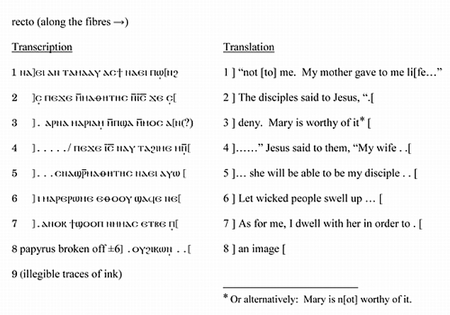 Fragmentul de papirus este mai mic decât o carte de vizită, conţinând opt rânduri de text ce pot fi citite cu ajutorul unei lupe. În rândul aflat imediat sub cel în care Iisus vorbeşte despre soţia sa există o altă propoziţie surprinzătoare, Iisus afirmând „ea va putea fi discipolul meu”.