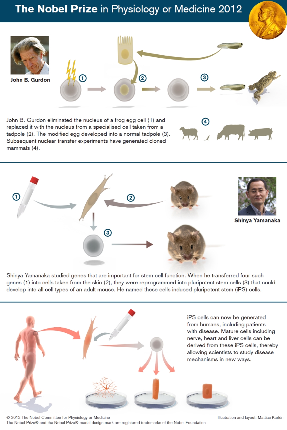 Premiul a fost împărţit de doi pionieri ai a studiiilor privind celulele stem: John Gurdon, din Marea Britanie, şi Shinya Yamanaka, din Japonia.