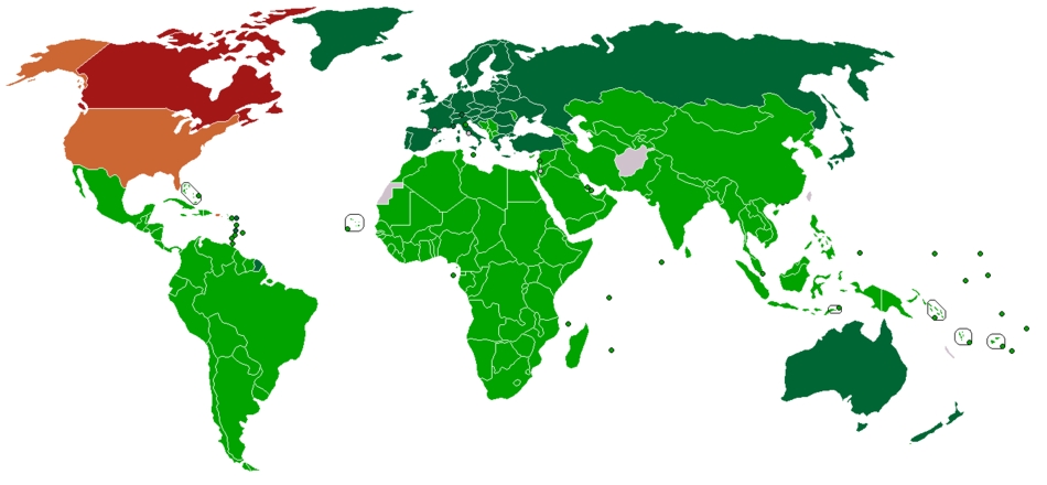 Ţările colorate în verde au ratificat tratatul de la Kyoto. Cu portocaliu sunt colorate ţările care nu intenţionează să ratifice tratatul, iar cu roşu ţările care s-au retras din tratat