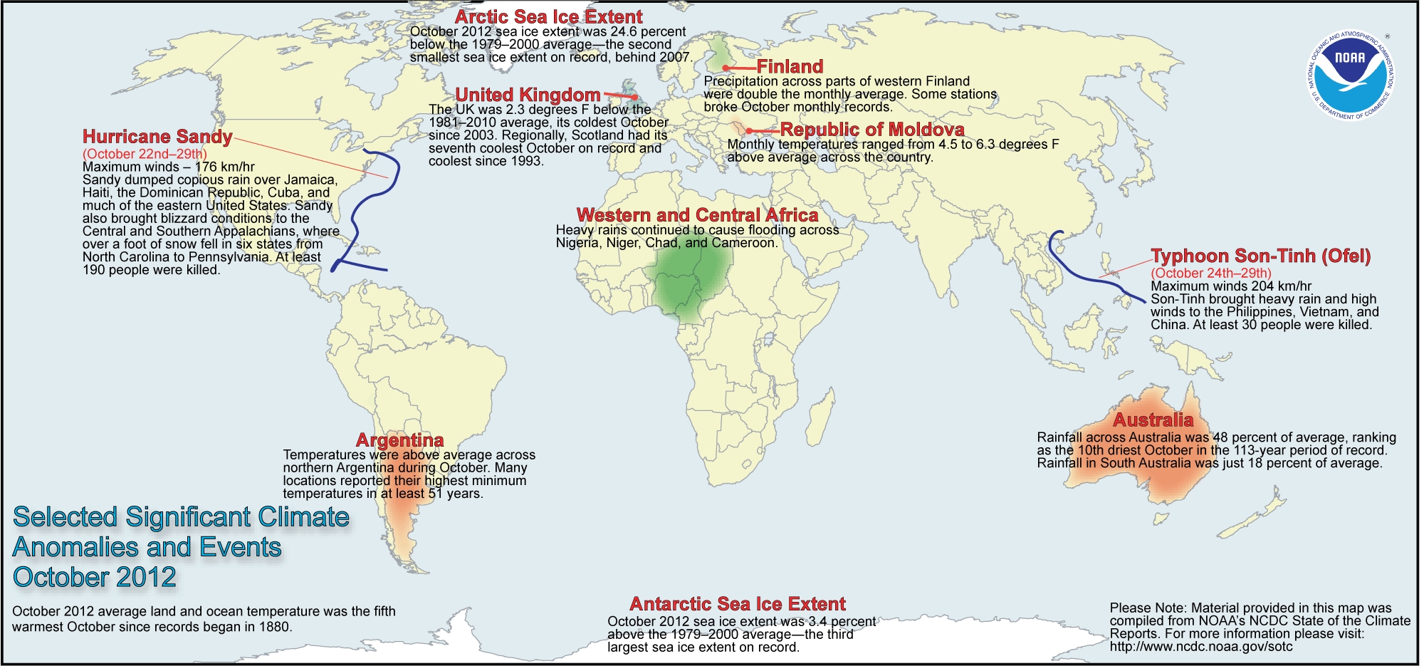 Statele Unite ale Americii au observat la rândul lor temperaturi record, iar apele din estul SUA au fost şi ele mai calde decât de obicei, ceea ce a facilitat apariţia uraganului Sandy.
