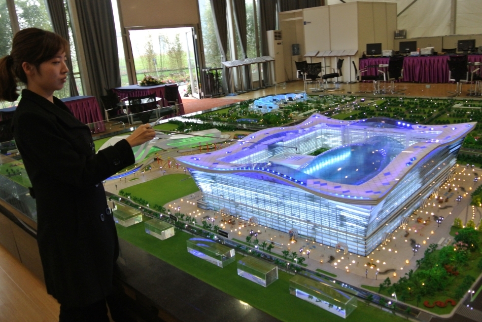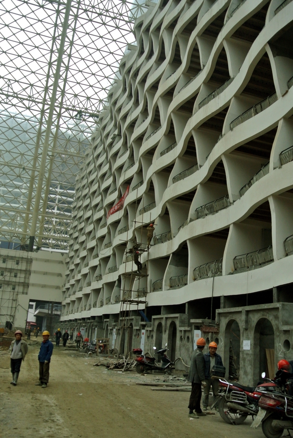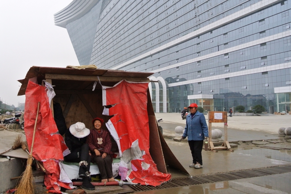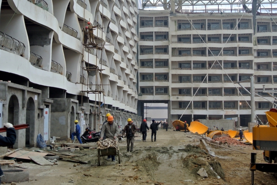 Faţada exterioară a clădirii este aproape de finalizare, o armată de muncitori lucrând să termine clădirea proiectată de arhitecţii chinezi la timp pentru o conferinţă internaţională organizată de revista americană Fortune în luna iunie 2013.