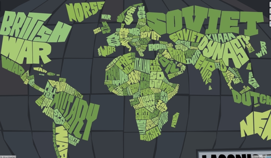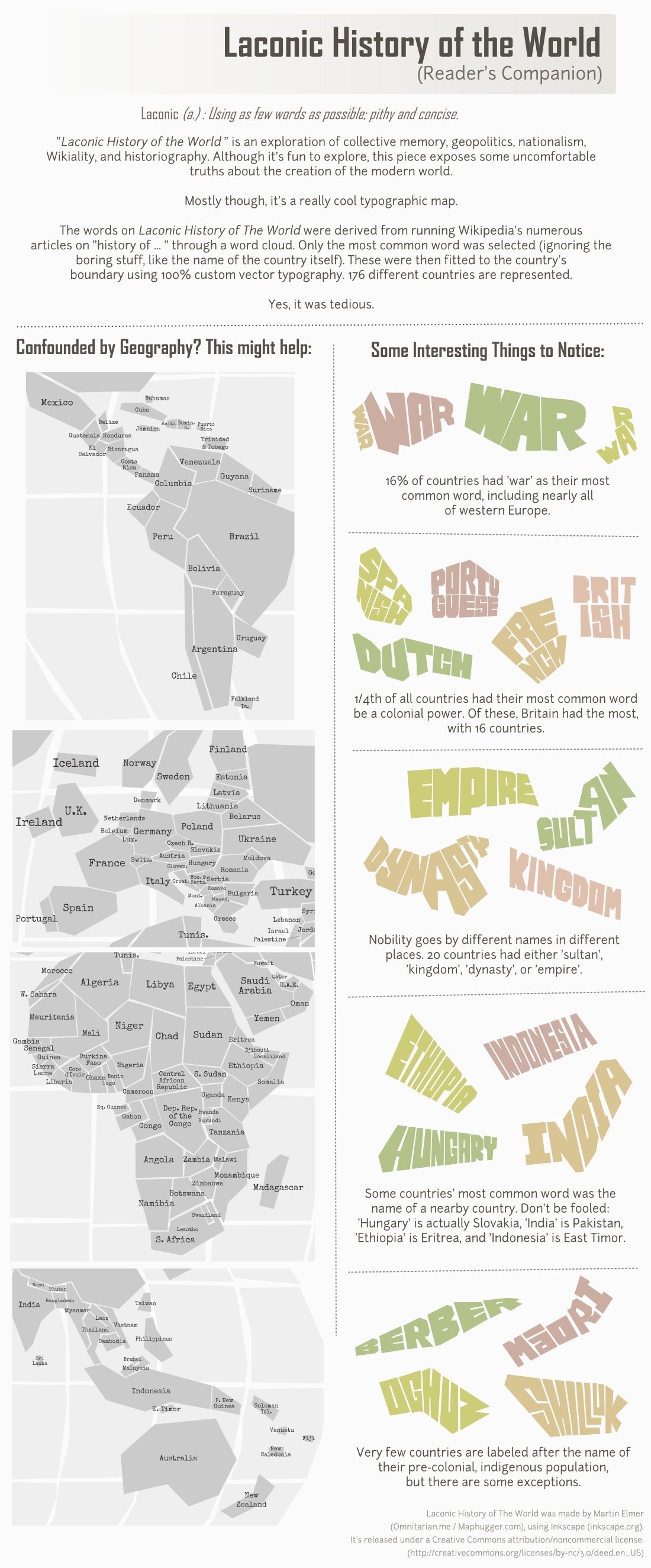 Elmer a explicat modul în care a creat această hartă, intitulată „Istoria laconică a lumii”: „Această hartă a fost creat folosind fiecare articol de tip „History of _________” din varianta în engleză a Wikipedia, acestea fiind introduse într-un generator de «word cloud». Cel mai folosit cuvânt în acel articol era introdus între graniţele ţării”.