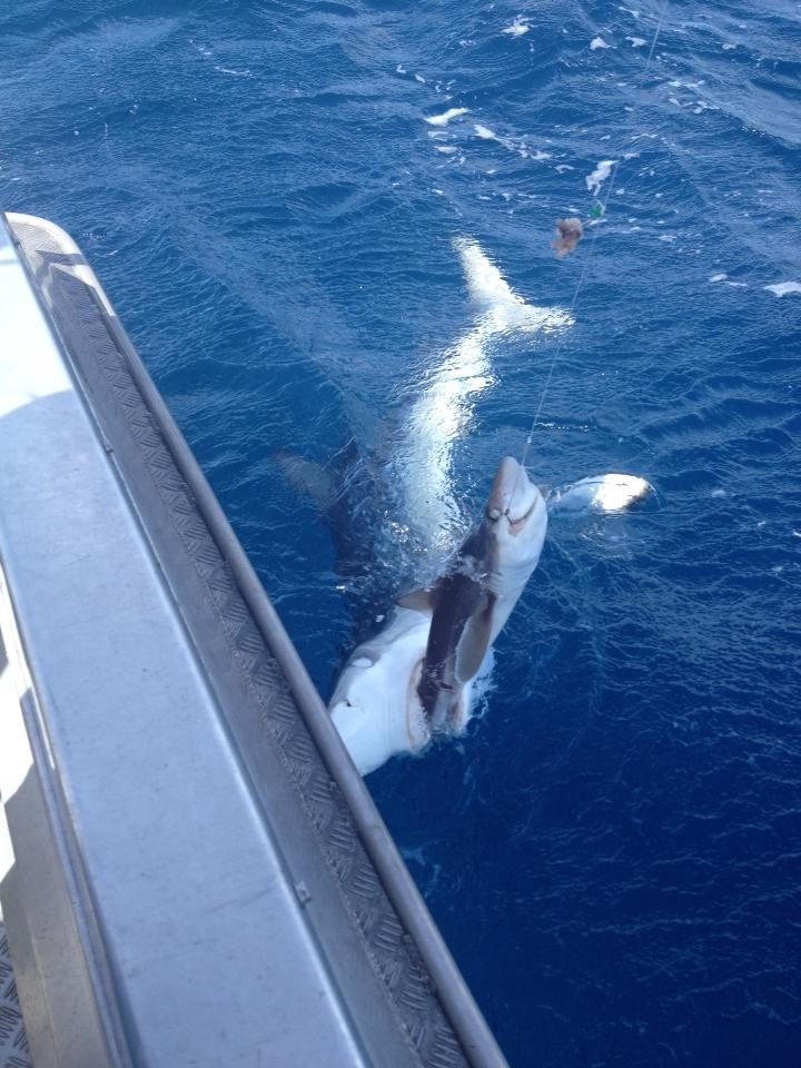Rechinul de dimensiuni obişnuite a fost pescuit în apele de lângă Kaiteriteri în cadrul unei expediţii efectuate pe 28 decembrie. Pescarul ce a postat sub porecla „Mancubus” era probabil mulţumit de captura sa, când deodată şi-a făcut apariţia un competitor: un rechin şi mai mare.