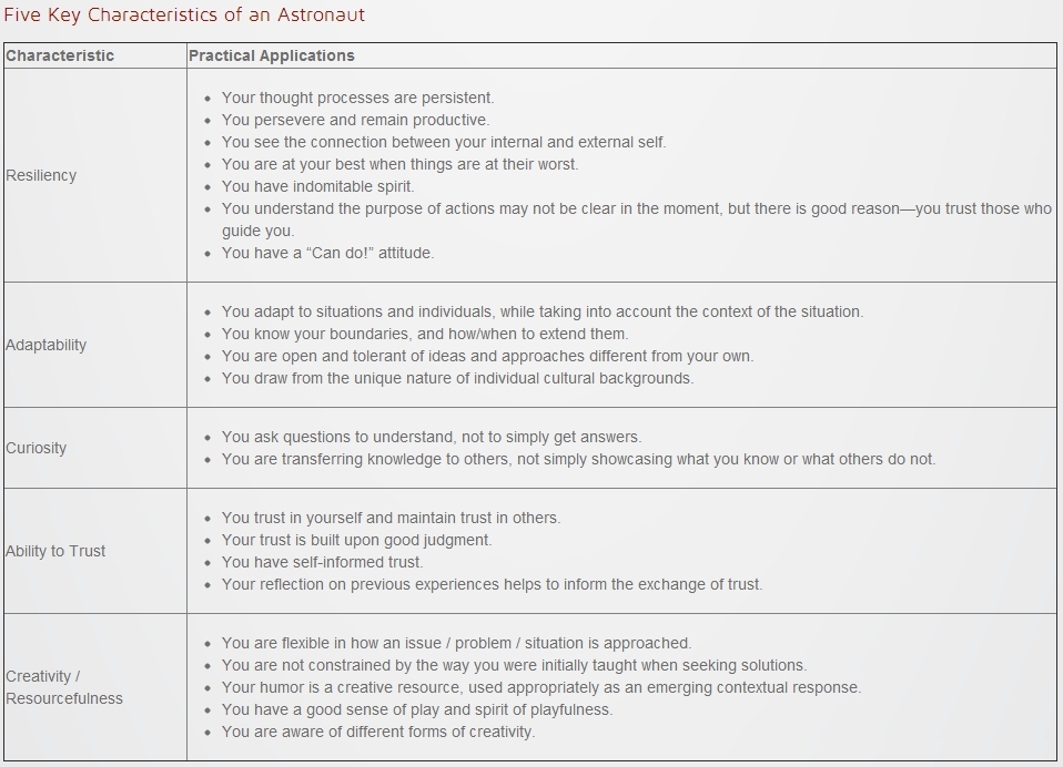 „Au trecut vremurile în care criteriile cele mai importante erau curajul şi numărul de ore petrecute la bordul unui jet supersonic”, a explicat Norbert Kraft, directorul medical al Mars One şi totodată un fost cercetător al NASA. „Acum suntem mai degrabă îngrijoraţi de felul în care fiecare astronaut se înţelege şi trăieşte alături de ceilalţi în contextul lungii călătorii dintre Pământ şi Marte, ţinând seama de numeroasele provocări cu care se vor confrunta tot restul vieţii”, a mai spus Kraft.