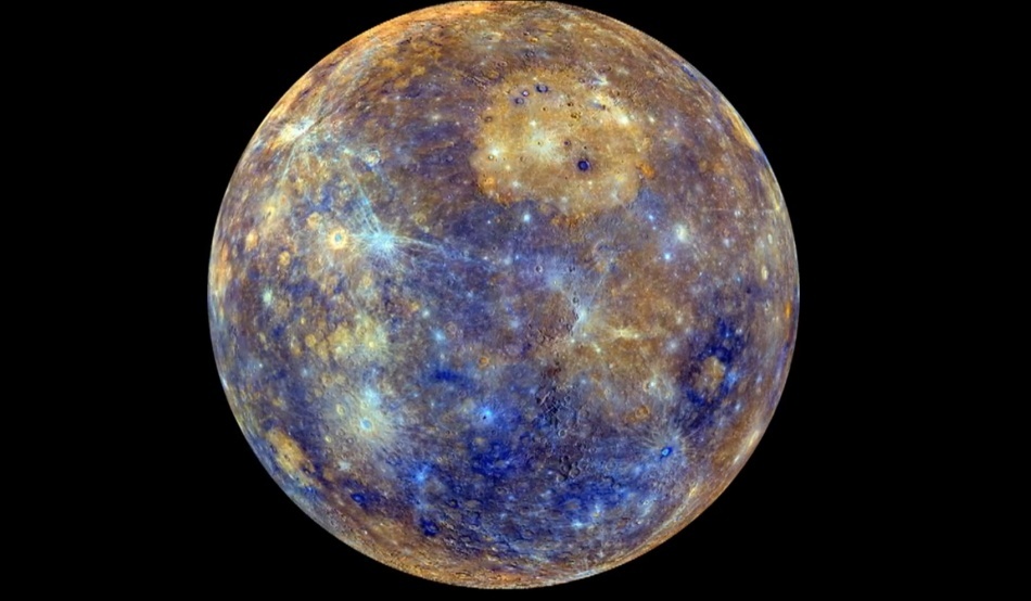 Zona circulară destul de întinsă observată în emisfera nordică este bazinul Caloris, al cărui interior este alcătuit din sol vulcanic mai tânăr., în timp ce punctele mici şi portocalii de pe suprafaţa lui Mrecurs sunt materiale aduse la suprafaţă de exploziile vulcanice.