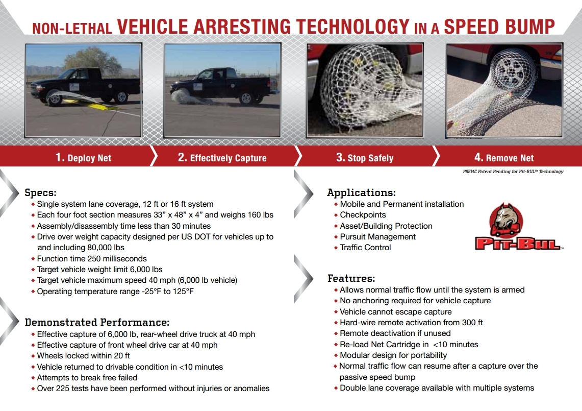 Tehnologia poartă numele de Pit-BUL (o prescurtare a numelui întreg, Pit–Ballistic Undercarriage Lanyard), fiind conceput de compania americană Pacific Scientific Energetic Materials. Reprezentanţii companiei afirmă că tehnologia poate fi folosită pentru a opri orice tip de automobil, fie că este vorba despre o maşină compactă sau de un SUV de mari dimensiuni.