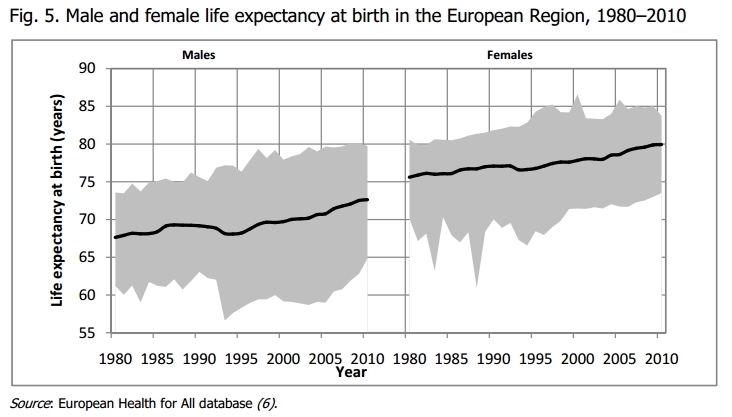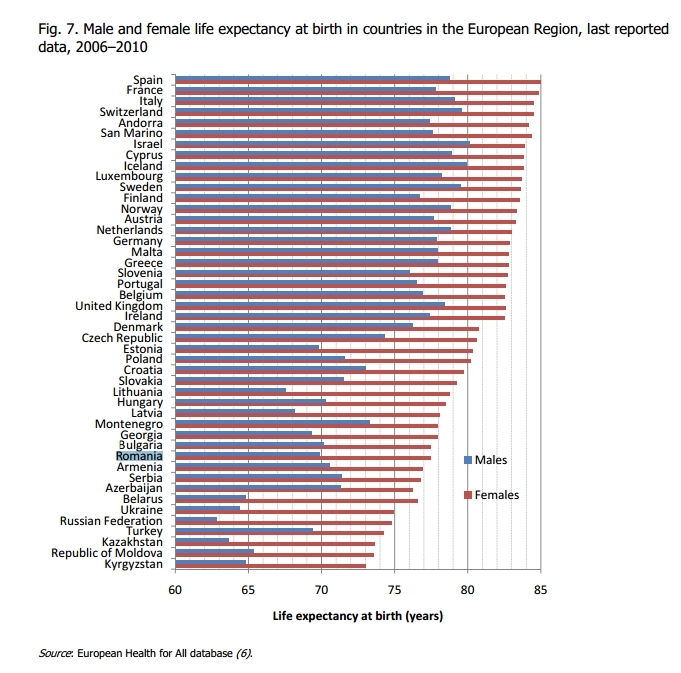 Statisticile la nivelul anului 2010 arată că femeile din Europa trăiesc, în medie, 80 de ani, pe când speranţa medie de viaţă la bărbaţi este de doar 72,5 ani.