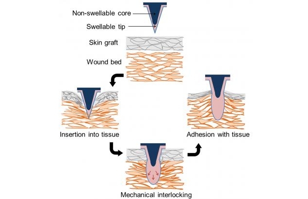 În schimb, noul pansament poate acoperi întreaga zonă grefată, microacele sale străpungând atât pielea grefată, cât şi derma receptorului. E ca şi cum în loc de a lipi un poster cu scotch, pe margini, posterul ar fi fixat cu sute de piuneze invizibile repartizate pe întreaga suprafaţă.