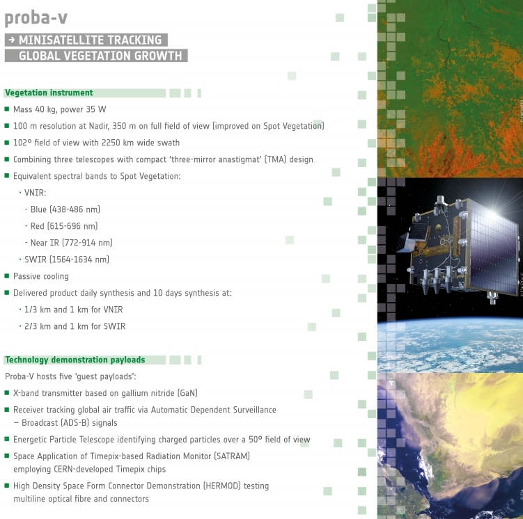 Cu o greutate de doar 160 de kilograme, Proba-V are misiunea de a cartografia zonele acoperite cu vegetaţie şi variaţiile acestora la suprafaţa Globului, cu un ritm aproape zilnic. Acest satelit al Agenţiei Spaţiale Europene (ESA) este echipat cu o versiune redusă şi îmbunătăţită a instrumentului „Végétation” care echipează sateliţii din gama „Spot”.