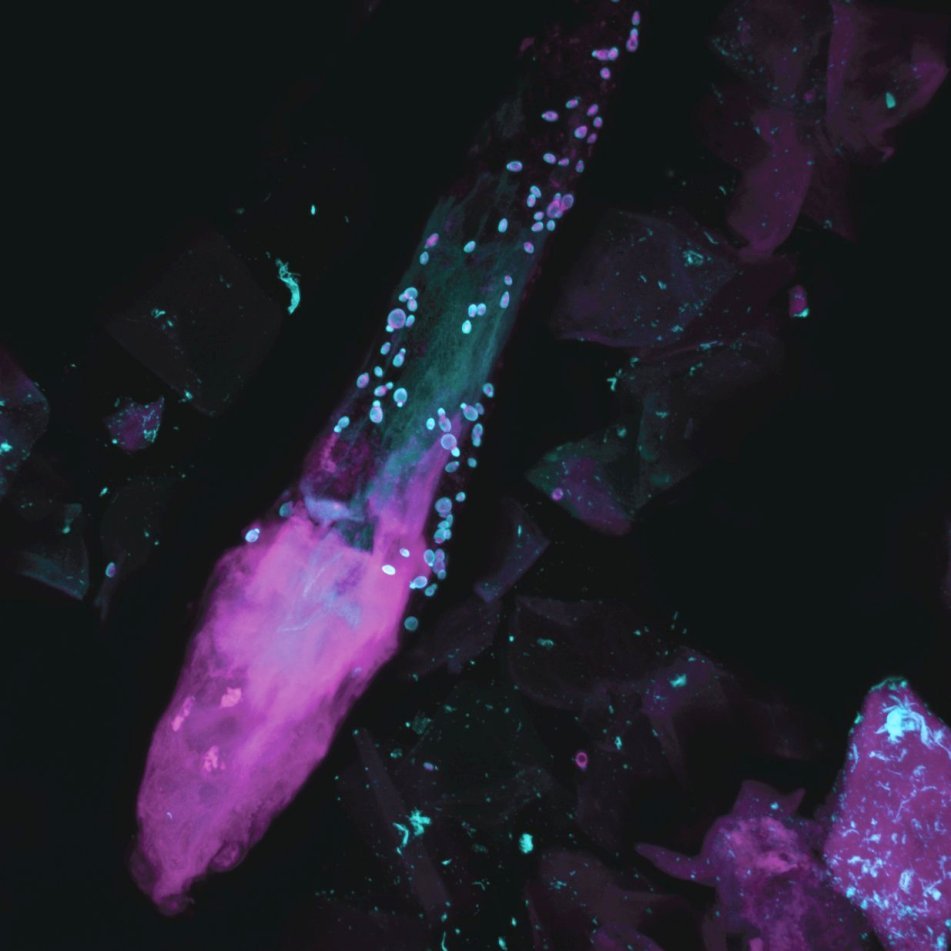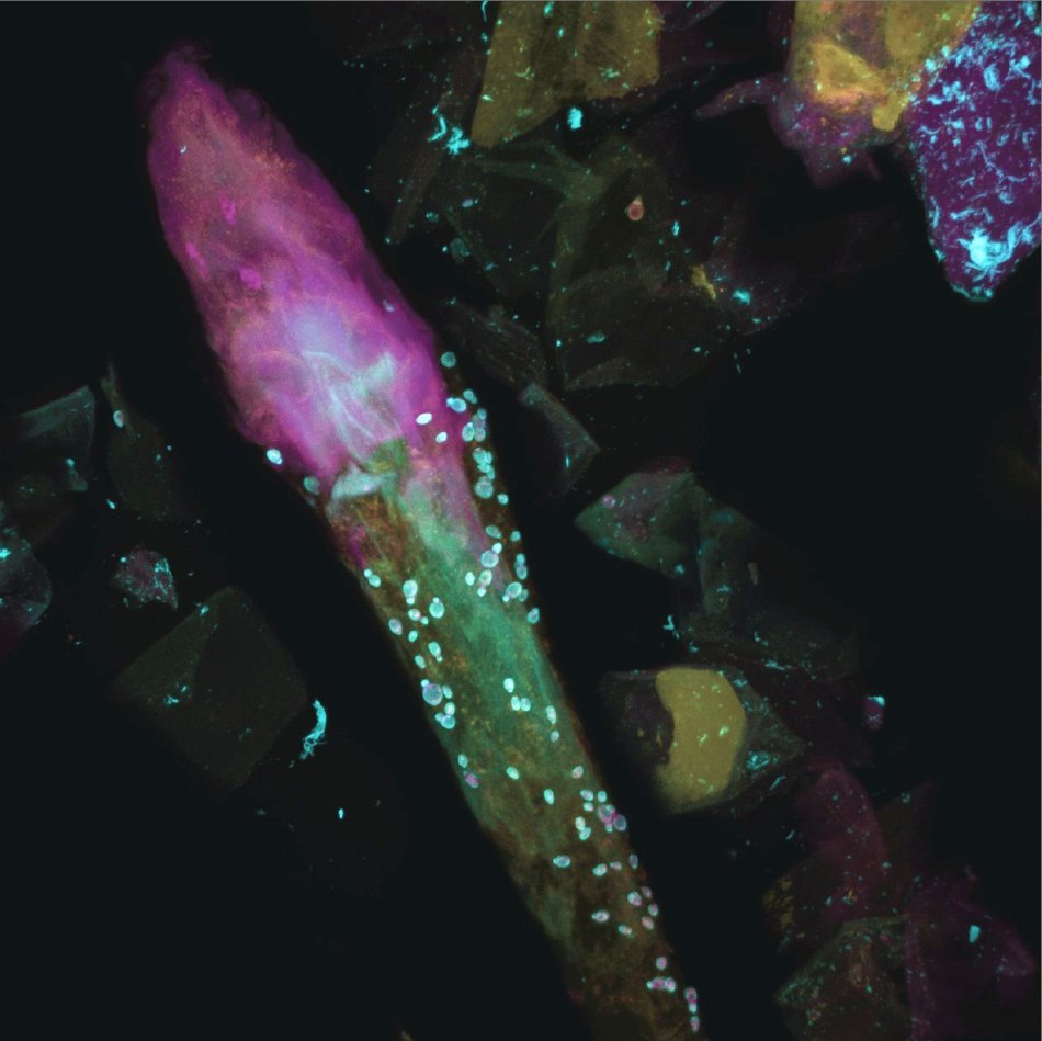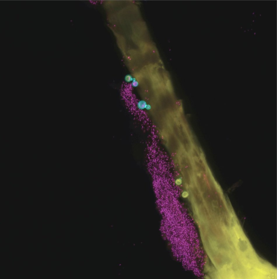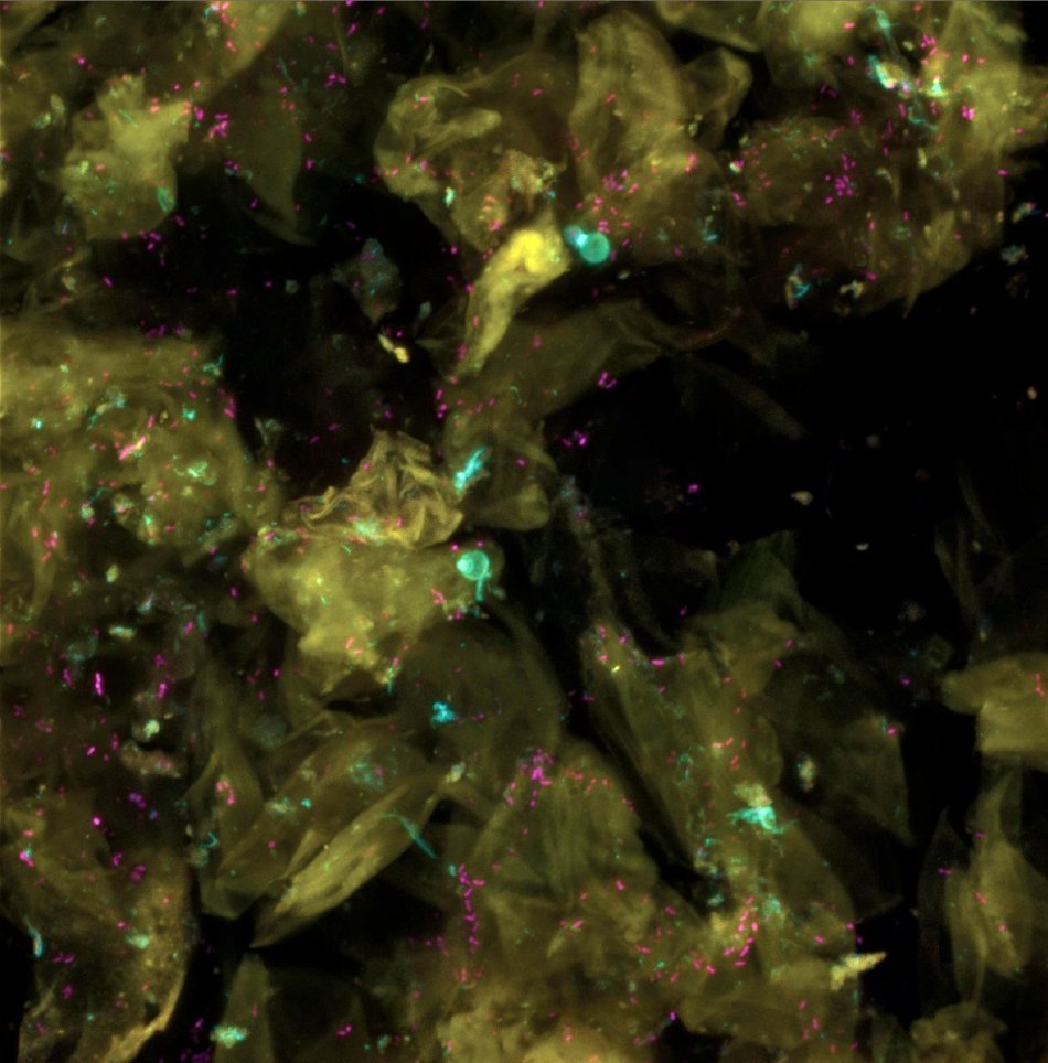 Pielea corpului uman este un ecosistem complex, pe care trăiesc numeroase specii de microorganisme – ciuperci microscopice, bacterii, virusuri – care alcătuiesc, colectiv, microbiomul pielii. (În imaginile de mai jos, bacteriile apar colorate în roz, iar fungii în albastru-verzui; porţiuni din firele de păr apar colorate în galben.)