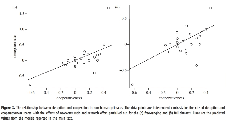 De aceea, minciuna ca un act de auto-conservare ar putea fi importantă pentru menţinerea unei societăţi complexe, ce se bazează pe relaţii. Mai exact, cei doi cercetători care au efectuat acest studiu – Luke McNally şi Andrew L. Jackson de la Trinity College din Dublin – au descoperit că minciuna era o tactică folosită de maimuţe de fiecare dată când era nevoie de un nivel înalt al comportamentului cooperant. Aşa cum se poate observa în graficul de mai jos, cele două prezintă o legătură strânsă – cu cât un grup de primate este mai cooperant, cu atât este mai mare probabilitatea ca acesta să folosească o minciună: