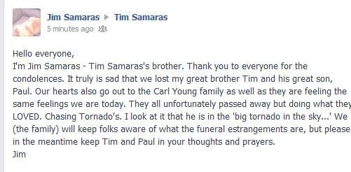 Fiul lui Tim Samaras, Paul, şi colegul său din această emisiune, Carl Young, au murit la rândul lor vineri. Cei trei „urmăreau” tornada EF3 din apropiere de oraşul El Reno.