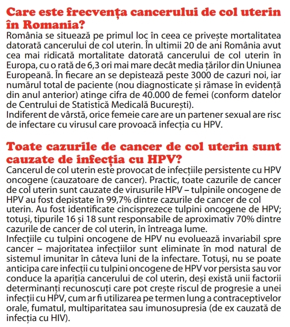 HPV se află totodată la originea a 99% din cazurile de cancer al uterului, potrivit unui studiu realizat de cercetătorii din sistemul de sănătate britanic (NHS). România se situează pe primul loc în ceea ce priveşte mortalitatea datorată cancerului de col uterin. În ultimii 20 de ani România a avut cea mai ridicată mortalitate datorată cancerului de col uterin în Europa, cu o rată de 6,3 ori mai mare decît media ţărilor din Uniunea Europeană. În fiecare an se depistează peste 3000 de cazuri noi, iar numărul total de paciente (nou diagnosticate şi rămase în evidenţă din anul anterior) atinge cifra de 40.000 de femei (conform datelor Centrului de Statistică Medicală Bucureşti).