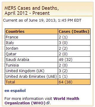 Organizaţia Mondială a Sănătăţii a înregistrat până acum peste 60 de cazuri de MERS (Middle Eastern Respiratory Syndrome), aşa cum este intitulat noul virus, şi 38 de decese, cele mai multe în Arabia Saudită. Până acum, boala nu s-a răspândit la fel de repede ca SARS în 2003, atunci când acel virus a dus la o epidemie globală soldată cu moartea a 800 de persoane.