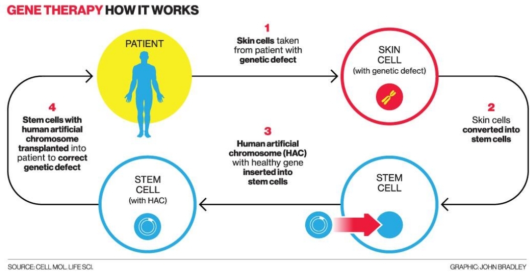 „Metoda funcţionează astfel: sunt prelevate celule epiteliale de la un pacient, sunt transformate în celule stem, iar în aceste celule stem sunt introduşi cromozomi umani artificiali ce conţin copii sănătoase ale genei afecţiunii. Aceste celule, cu cromozomul suplimentar, sunt ulterior introduse înapoi în pacient pentru a-i trata boala”, a explicat specialista.