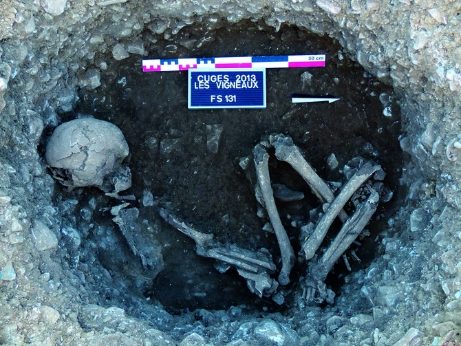 „Este primul mormânt paleolitic în aer liber”, a adăugat el. Acest arheolog a descoperit, în septembrie 2011, în ultimele zile ale lucrărilor de prospectare efectuate de Institutul Naţional de Cercetări Arheologice Preventive (INRAP), pe un sit de 1,8 hectare pe care trebuia construit un centru comercial, un fragment de craniu.